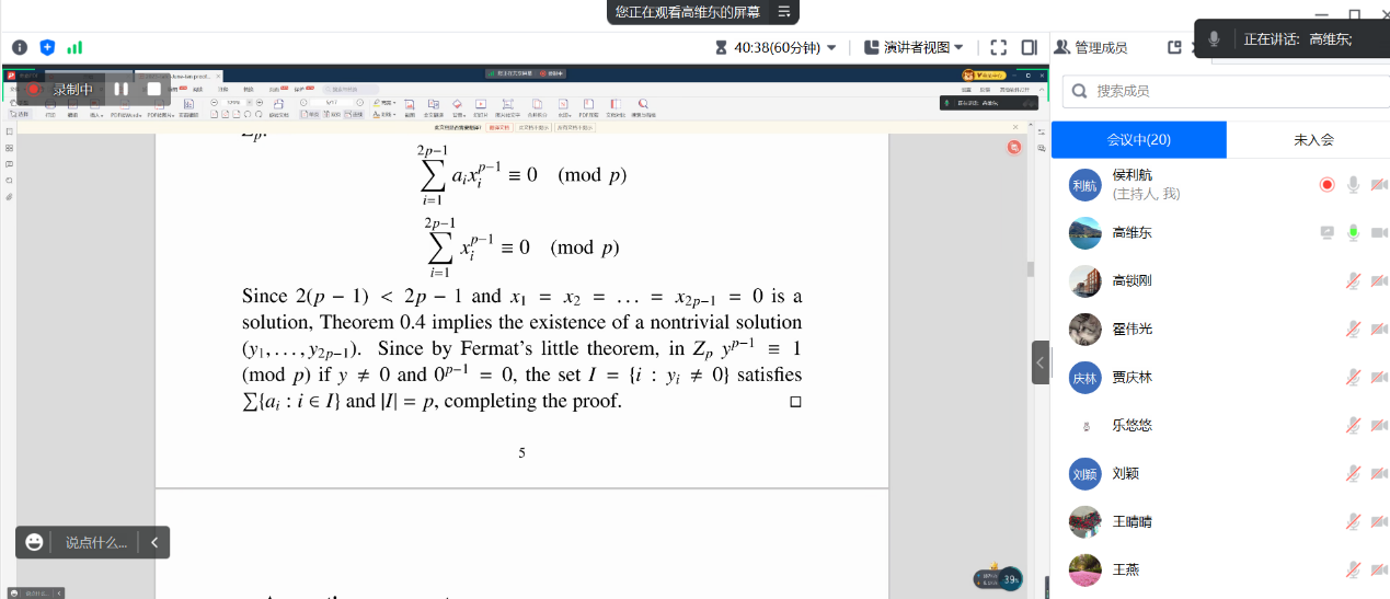 高维东教授结合自身的科研成果,详细地介绍了关于Erdos-Ginzburg-Ziv定理证明的几个不同数学方法, 使线上师生进一步领略到了数学的魅力。报告后,高维东教授就线上师生提出的问题,与教学部师生进行了深入的交流。近期系列学术报告,教学部师生积极参与,反响热烈。91麻豆