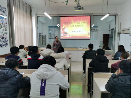 2018级全体党员和积极分子集体观看大型电视纪录片《为了和平》第一集《正义担当》,并开展主题教育班会,活动由2018级辅导员石彩静老师组织。主题班会结束后,各班党员和积极分子自发在班级群里动员同学观看纪录片《为了和平》,并发表观后感。