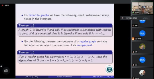 5月12日下午,特邀华中师范大学数学与统计学学院教授、博士生导师李书超老师在腾讯会议平台为学院师生作了关于“Graphs, Digraphs, Mixed Graphs and Their Corresponding Matrices”的学术报告,高等数学教研室康娜主任主持了报告会。教学部相关研究方向的教师以及全体研究生聆听了报告,并与李书超教授进行了研讨。