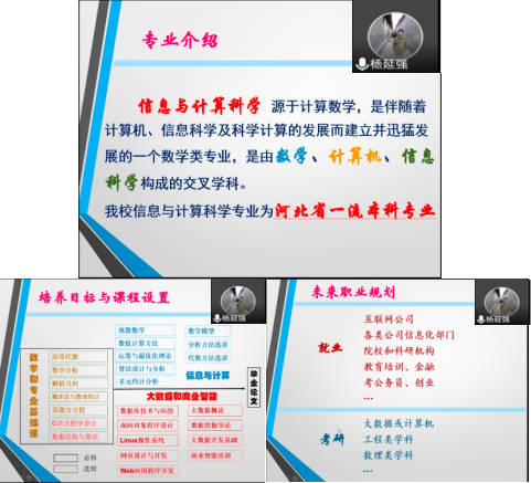 信息与计算科学专业的杨延强老师介绍了作为河北省一流本科专业的信息与计算科学专业,他从信计专业的优势、培养目标与课程设置、学生未来职业规划及我校的校企合作四个方面做出了详细介绍。杨主任重点提到信计专业主修数据结构与算法、算法设计与分析、大数据概论、数据库技术与应用、大数据开发基础等课程,同时早已开设的多元统计分析、代数方法选讲等选修课也可供学生选择,可以丰富学生知识体系。