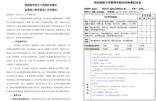 关于疫情防控期间加强线上教学督查工作的通知》,成立了由教学部领导、教研室主任、辅导员、教学秘书组成的多点、多层、多面的线上联动教学督查小组。通过教师自查、学部督查、学生参与的检查形式,形成“线上听课检查、教学反馈,线下督导交流”的分级督导、精准监控的模式,建立主动发现问题,及时调整,加强跟踪的闭环反馈系统,以查促改,以查促教。强化任课教师课程教学质量主体责任,提高质量意识,落实做细线上教学各环节要求和质量标准。