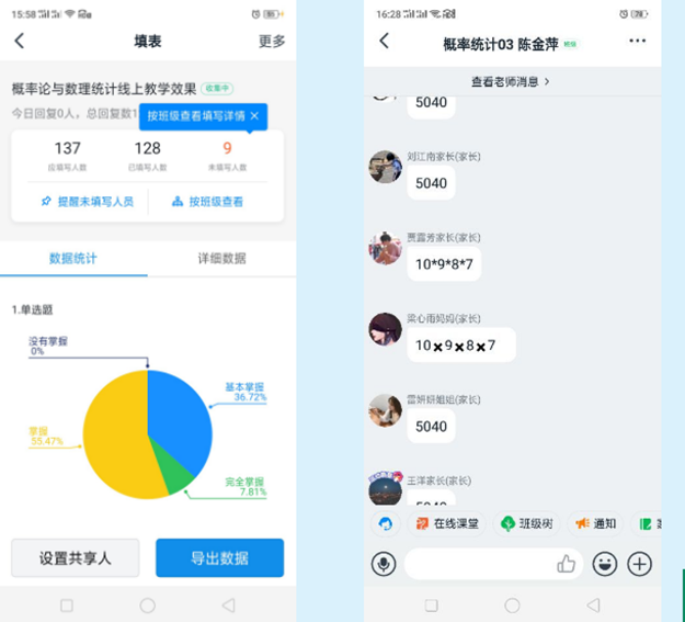 《高等数学》和《概率论与数理统计》是公共必修课,课程组老师要承担全校大一和大二学生的授课任务。当上课人员量大,就会造成网络拥堵、平台不稳而无法登陆,为保证课堂教学顺利进行,老师们在以学习通作为主要教学工具以外,都有自己的教学应急预案,而MOOC和钉钉直播相结合的模式就是学习通这一教学主体的两翼。课程组老师通过对大量课程视频观看、比较,最后确定了哈尔滨理工大学的《概率论与数理统计》以及深圳大学的《高等数学》MOOC作为学生观看的主要课程视频。在对重难点知识的讲解时,钉钉直播可以实现屏幕共享讲解内容,利用白板推导数学公式和典型例题的解题过程,连麦了解知晓学生对课程的理解程度,营造一种现实课堂的授课环境。同时钉钉群能够在课下联系到每一位同学,实现课后答疑的功能,这样教师就能随时随地及时了解学生们提出的问题,及时得到教学反馈。通过学生的反馈,多数学生反映基本掌握了课程内容,达到了良好的教学效果。当然,在一堂课的讲授过程中,如果条件允许,老师们可以切换教学工具,进行全方位立体教学。