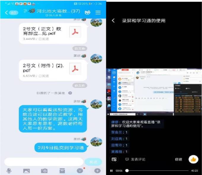 领导班子统一思想,步调一致,确立了“勇于担当,主动作为”的指导思想,把问题想在前面,立足为高标准完成春季学期教学任务,切实落实学校“开学延迟但授课不误”指示精神。学院领导多次召开在线教学工作会议讨论教学调整方案细节,强化监督指导。同时积极引导和组织教师参加各类在线教学技术培训,区分课程特点有针对性地制定并审核各项教学调整措施。为保障在线教学的顺利进行,安排有经验的老师专门就录屏软件的使用、利用学习通建课、如何利用钉钉和学习通进行直播等问题做了专门的在线讲解。为确保在线教学的工作落实到位,学院专门提出来进行在线教研活动的要求,并要求所有教师做好两手准备,提前录制开学两周内的课程视频。