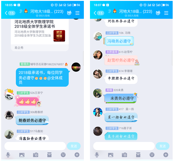 学生疫情防控倡议书》,有8名同学杨方斌、王衍豪、鲍春娇、李梦凡、野雪飞、万淑雅、万子康、闫海丽,自愿在老家小区、村口、社区排查登记外来返乡人员;一些同学利用假期陪伴家人、为父母下厨、辅导弟弟妹妹功课,一些同学上网查资料、把疫情知识发到群里、告知亲朋要理性对待疫情;一些同学拿出课本划重点、找电子资源分享给同学……在此2018级全体同学作出如下承诺: