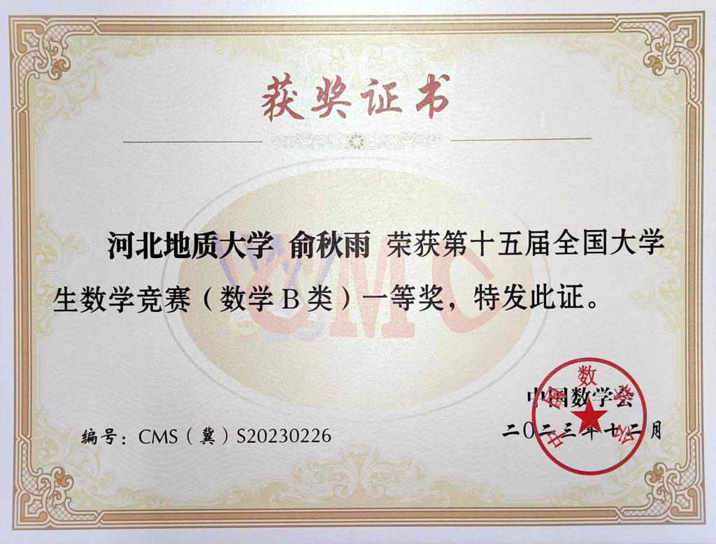 第十五届全国大学生数学竞赛分为初赛和决赛,我校2021级数学与应用数学专业学生俞秋雨获数学B类第8名,将代表河北赛区参加第十五届全国大学生数学竞赛决赛。这是我校学生第二次进入全国大学生数学竞赛决赛,是第十二届全国大学生数学竞赛后的又一佳绩。